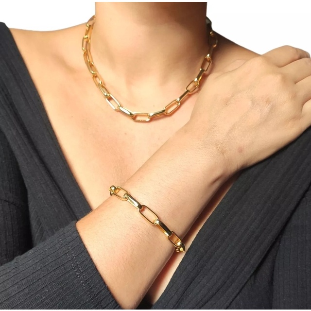 Kit Conjunto Colar Choker e Pulseira Corrente Elo Cartier Grosso Folheado Ouro 18k Inspiração Blogueira