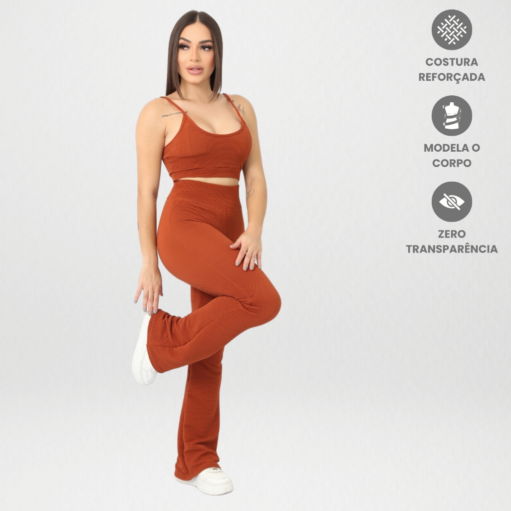 Conjunto Feminino Calça Flare e Top Alcinha Canelado Roupa Academia Treino Fitness Corrida Esportiva