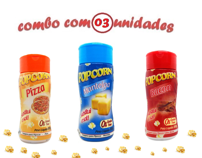Combo 3 Tempero para Pipoca Popcorn Sabores Manteiga, Pizza e Bacon