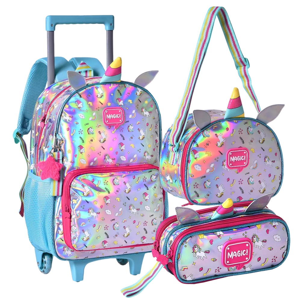 Kit Mochila Escolar Infantil com Carrinho de Rodinhas Lancheira e Estojo Unicórnio Khloe
