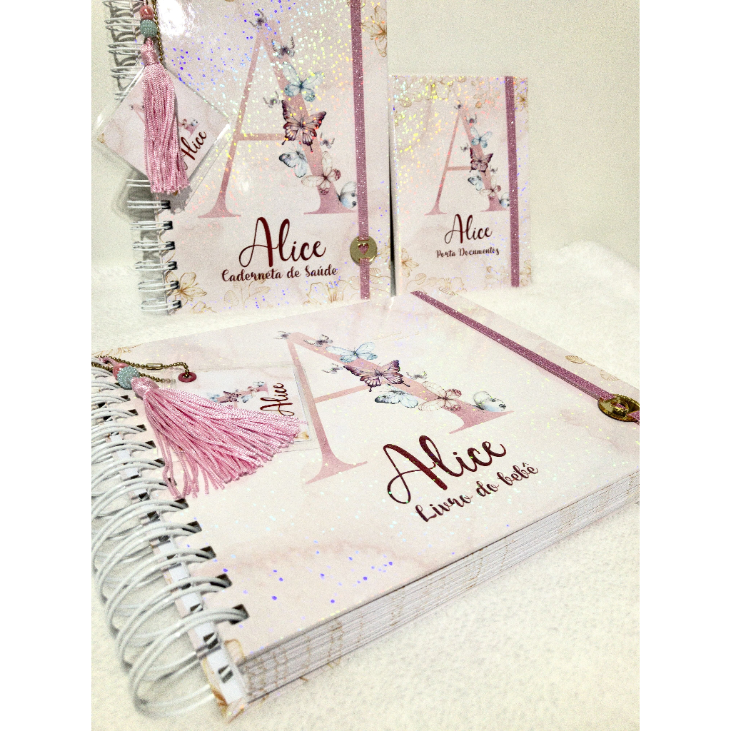 CADERNETA DE VACINA + PORTA DOCUMENTOS + LIVRO DO BEBE - BORBOLETAS - MENINA - PERSONALIZADA