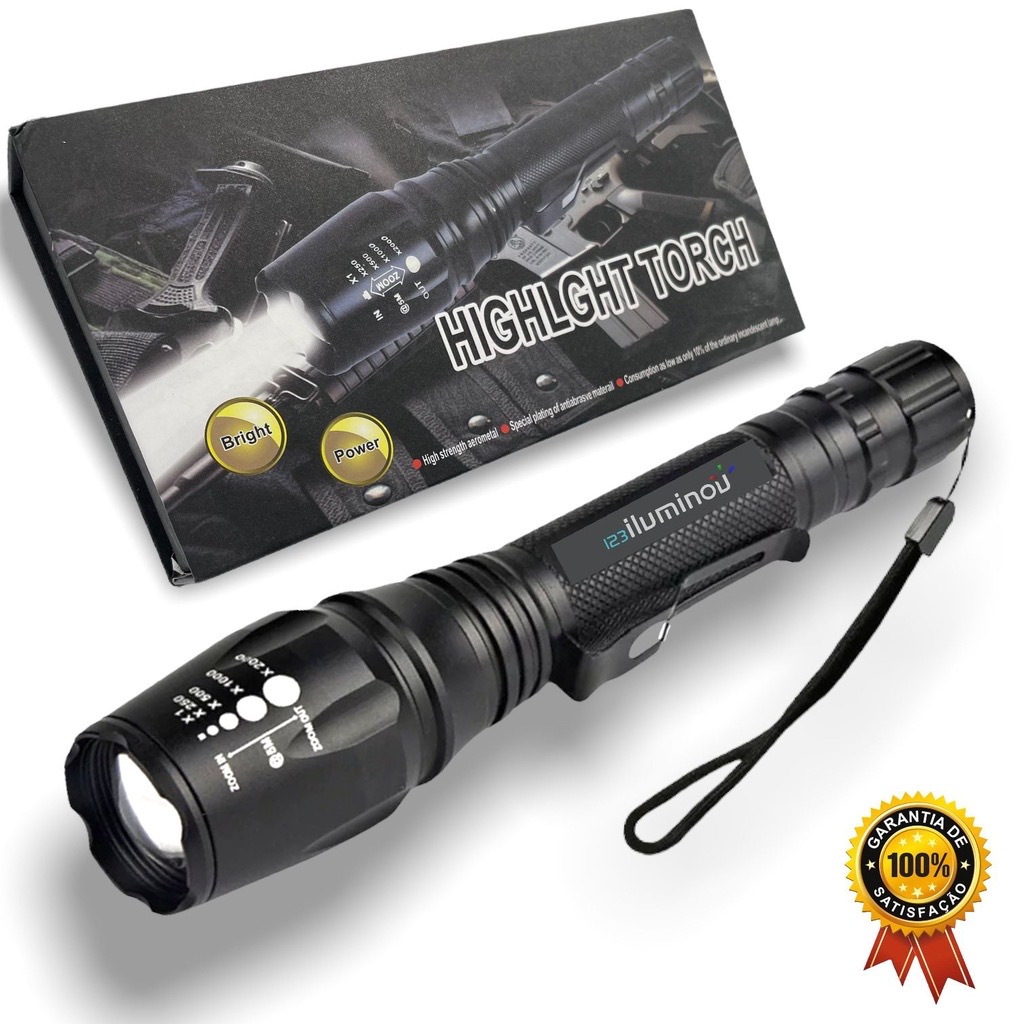 Lanterna T6 16500w 460000 Lumens Militar Zoom Recarregável LED 20cm Com Duas Baterias Com Carregador A Prova Dagua