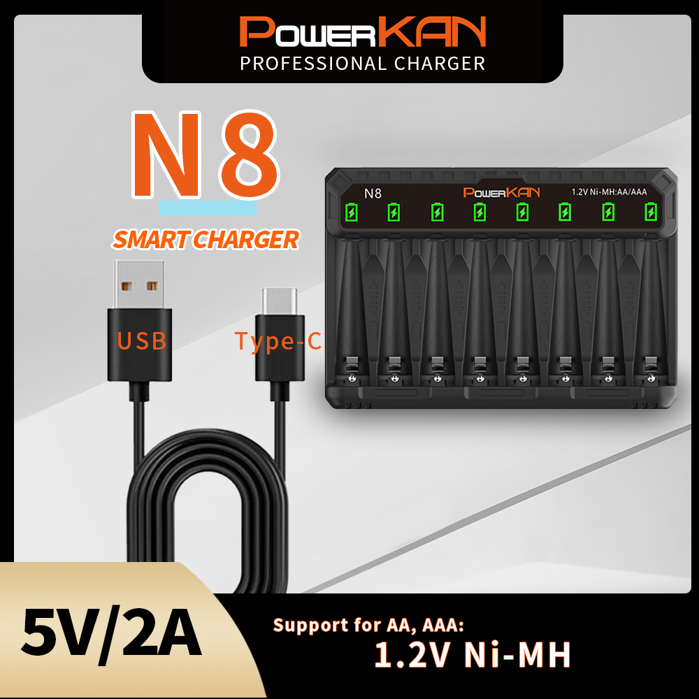 O LED Do Carregador De Bateria POWERKAN N8 Pode Ser Usado Independente Para 8 Baterias Recarregáveis 1.2V Ni-MH/Cd AA AAA USB 5V 2A Tipo C