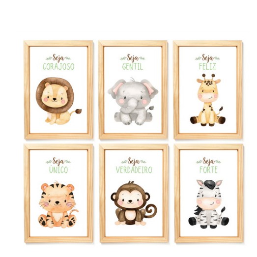 Kit com 6 Quadros Decorativos Safari Baby Aquarela 20x30 Sem Moldura Quarto Infantil Menino Menina Tema Safari