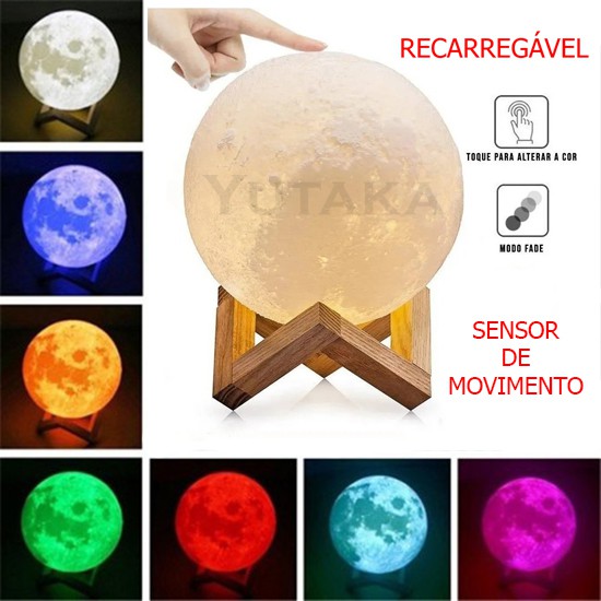 Luminária Lua Cheia 7 cores p/ Quarto Abajur 3D Led Touch Screen