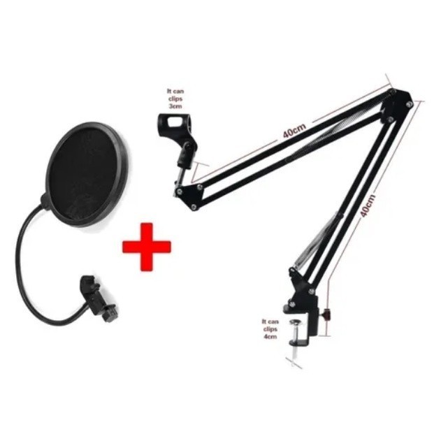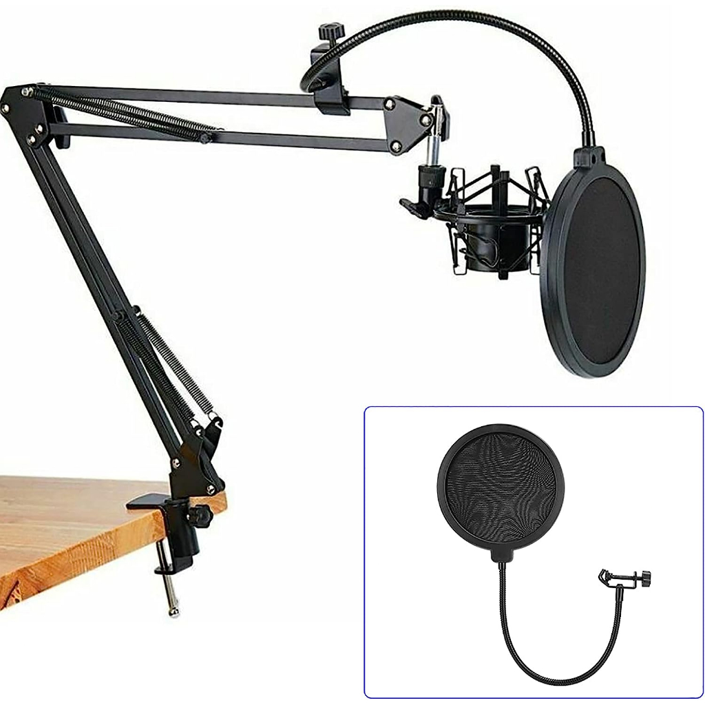 Braço Articulado para Microfone + Pop Filter Anti Puff para Estúdio, Haste Flexível e Membrana Dupla