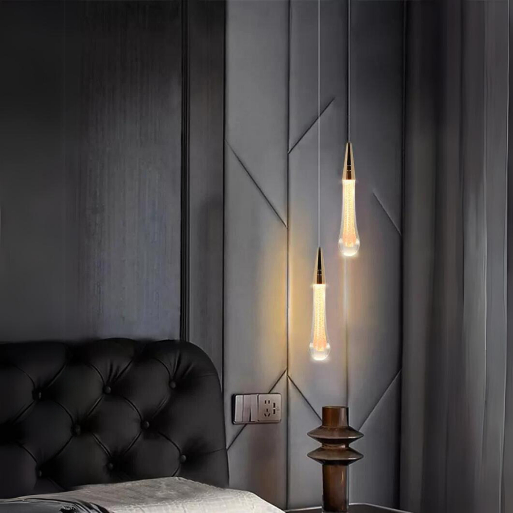 Kit 2 Luminárias Pendentes de Cristal LED Mini Gota Dourado Lavabo Quarto Cabeceira Moderna 3000K
