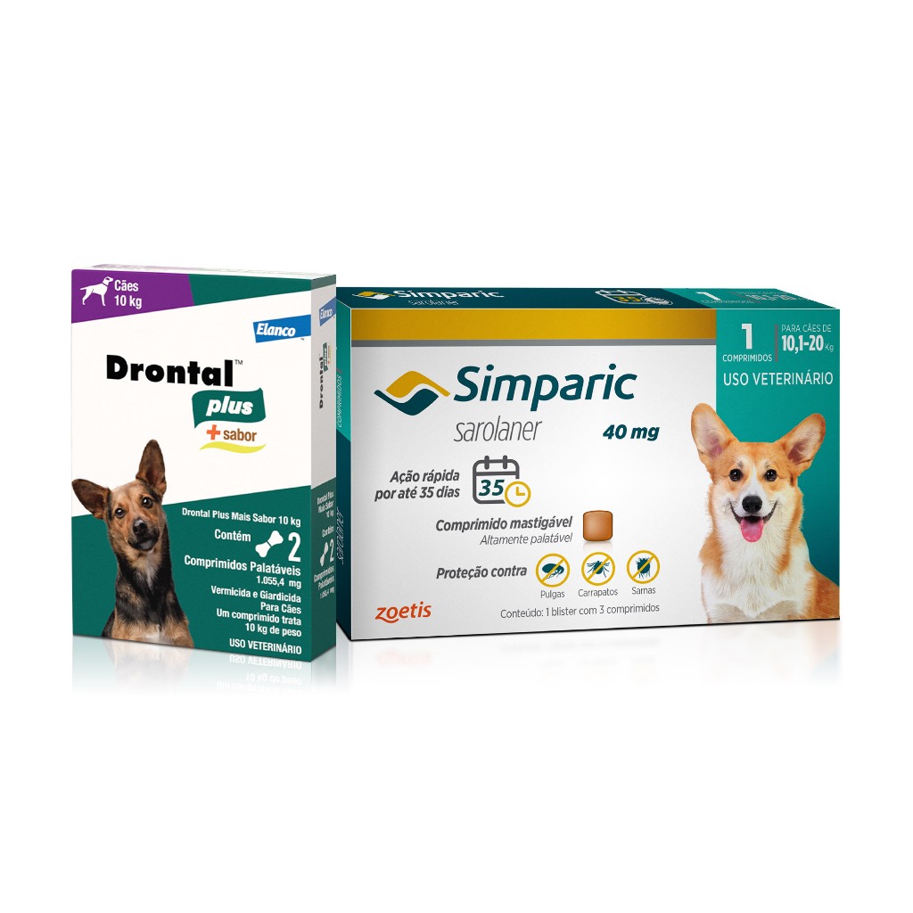 Kit Simparic Cães 10,1 a 20kg 1 Comprimido + Vermífugo Drontal Cães até 10kg 2 Comprimidos