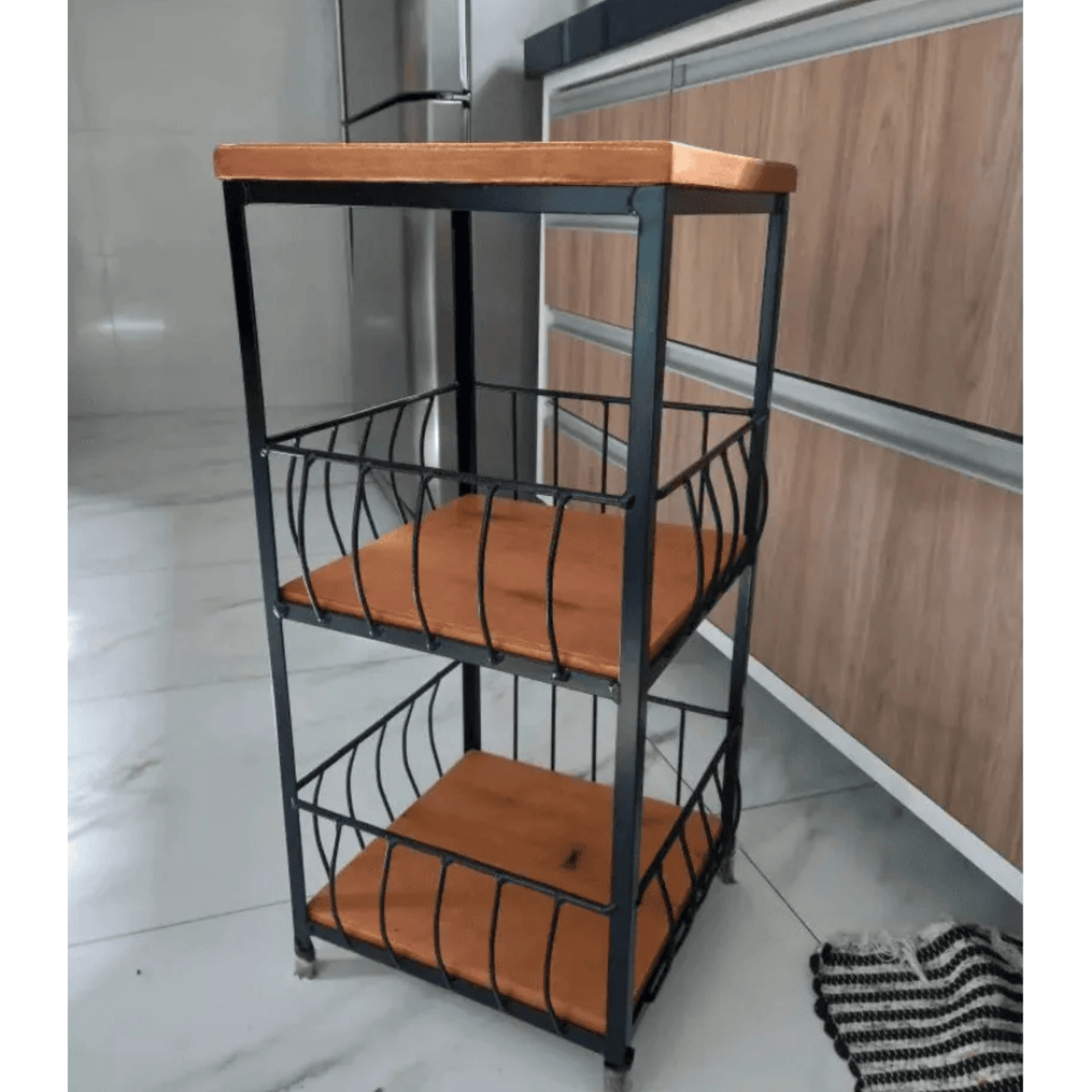 Fruteira Suporte Micro-ondas Para Cozinha com Cesto Organizador Base de Ferro Tampo de Madeira