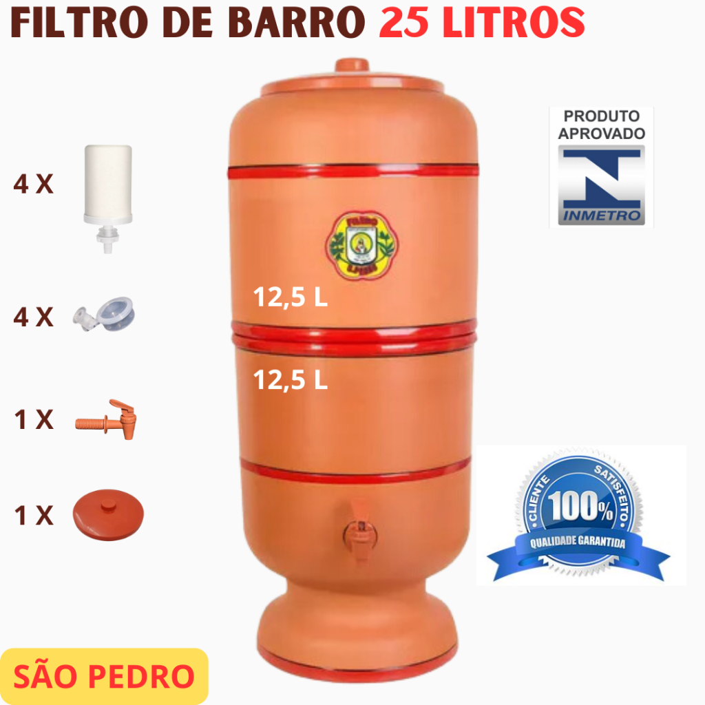 FILTRO DE BARRO 25 LITROS (12,5L + 12,5L) (MAIOR) COMPLETO - 4 VELAS - FILTRAGEM RÁPIDA - SÃO PEDRO