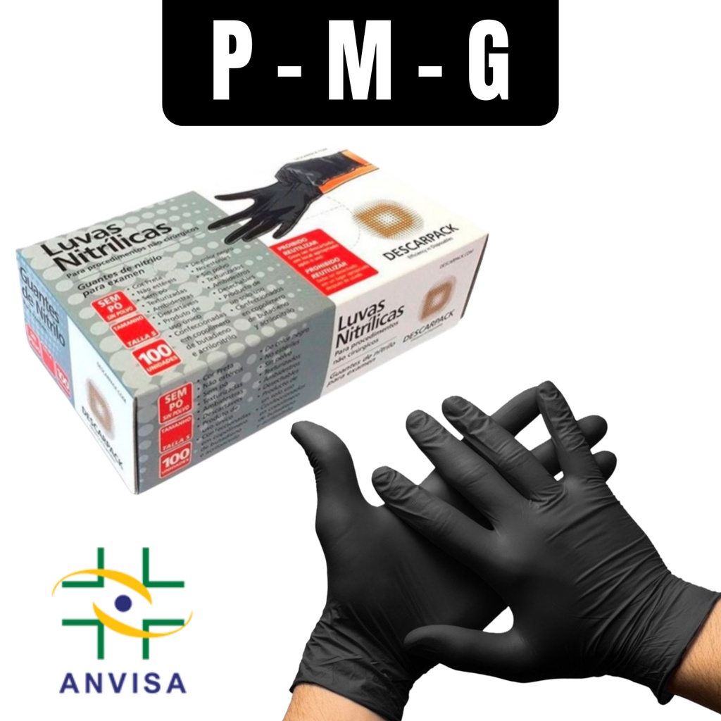 Luva Nitrílica Nitrílo Preta Descartável Sem Pó Descarpack C/100 Unidades Anvisa