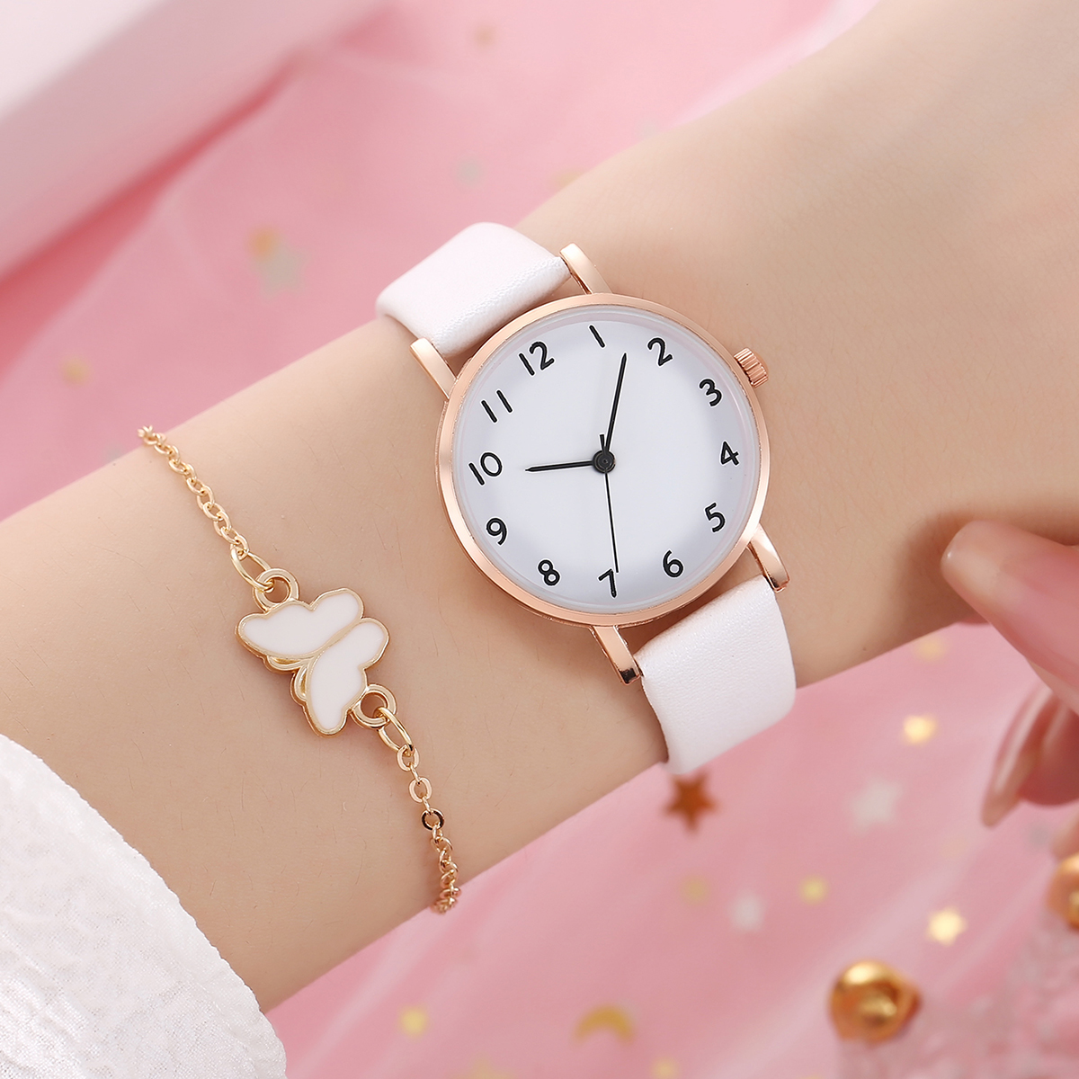 Nova Venda Quente Moda Moda Moda Simples Campus Estilo Campus Simples Couro Branco Fofo Rosa Senhoras Relógio e Pulseira Borboleta Conjunto de Férias Presente