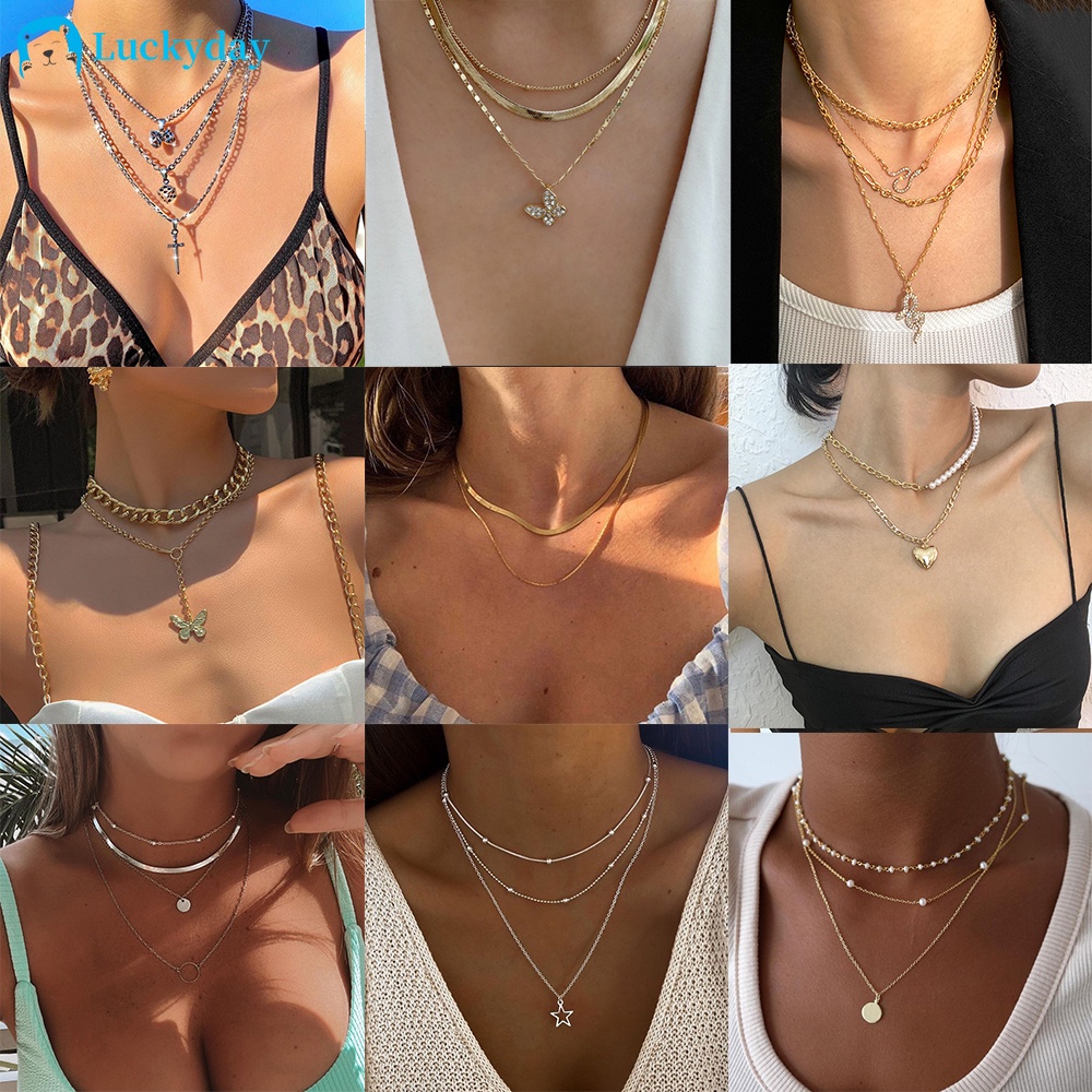 Moda Pérola Cadeia Colar De Ouro Prata Borboleta Coração Pingente Colares Multilayer Gargantilha Para As Mulheres Acessórios De Jóias
