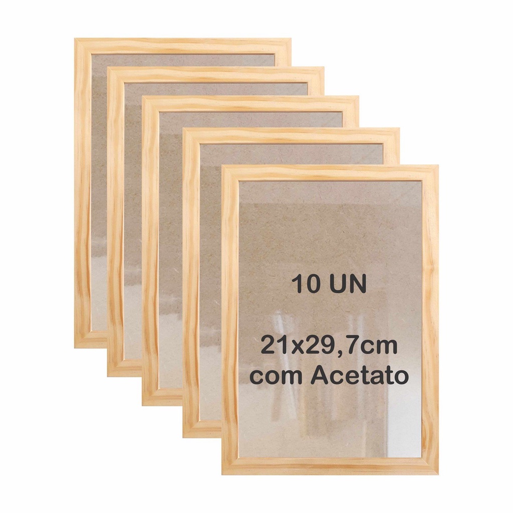 Kit 10 Molduras A4 21x29,7cm em Madeira de Pinus com Fundo e Acetato