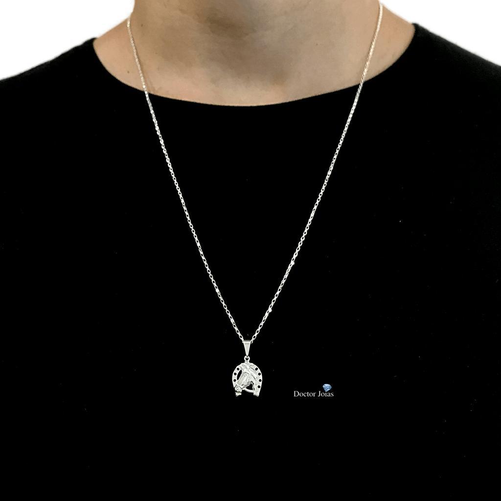 Cordão Masculino com Pingente Cavalo Ferradura Corrente Fina Colar Tijolinho 1mm Banhado a Prata 925