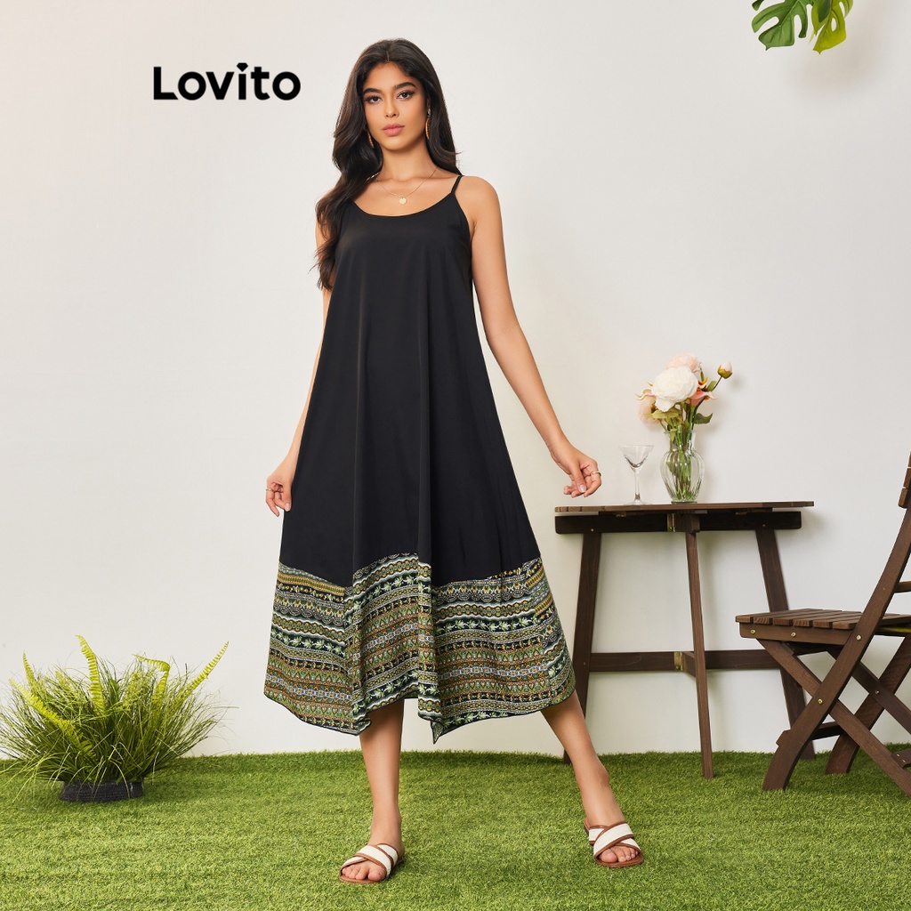 Lovito Casual Vestido Feminino com Estampa Barroca e Costura LBA05059 (Preto)