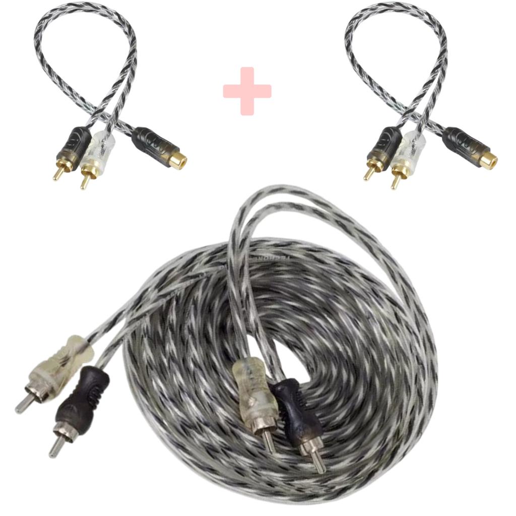 Kit 1 Cabo Rca De 5 Metros + 2 Cabos De 1 Metro Blindado Tech One Svart Conector Metálico Som Automotivo