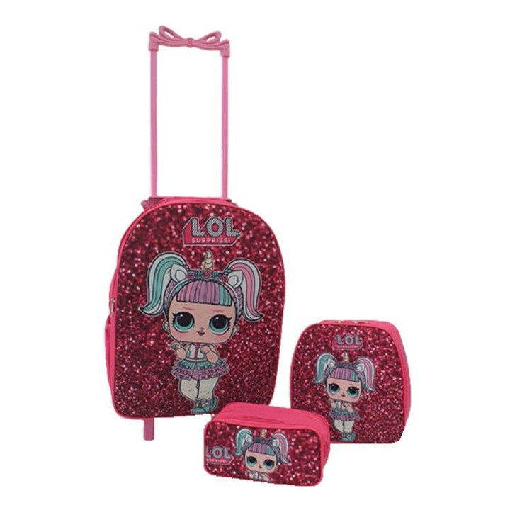 Kit Mochila Infantil LOL Unicórnio Shine de Rodinhas + Lancheira + Estojo Rosa