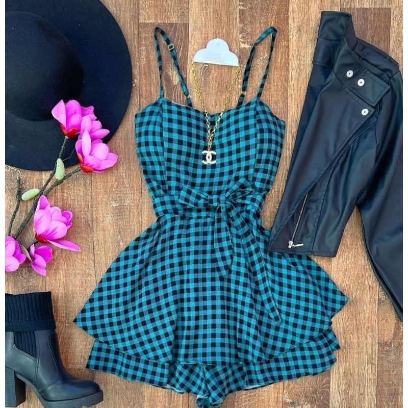 Macaquinho Vestido Estampado Xadrez Feminino Rodado Vestidos Macaquinho Borboleta Estampados Tecido Duna Moda Bloqueira Vestido Xadrez Macaquinho Xadrez