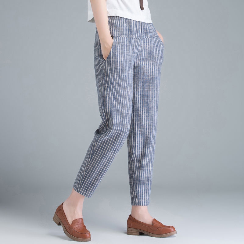 Calça Casual Feminina De Linho De Algodão Estilo Coreano De Cintura Alta Listrada Solta