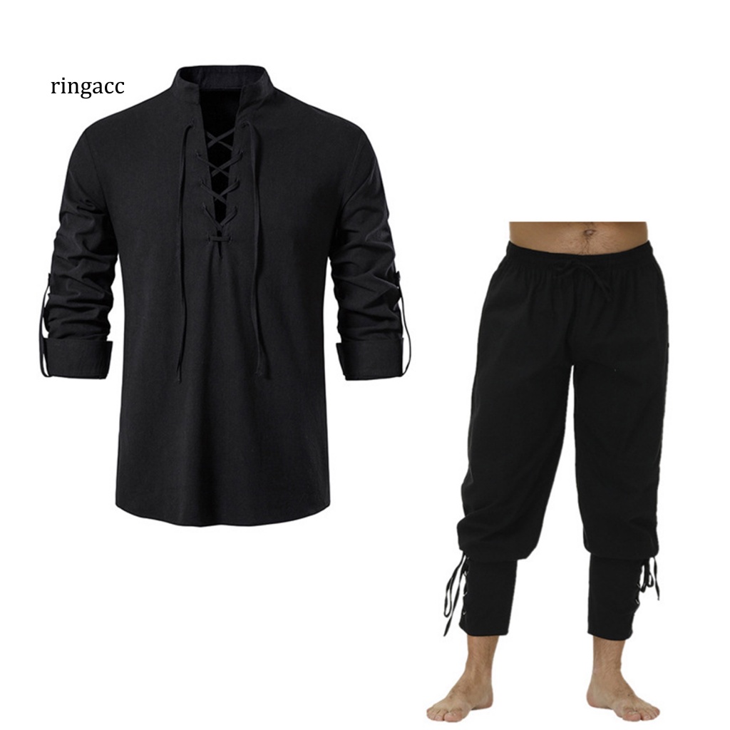 RGA Homem Casual Henley Camisa De Manga Comprida Linho Conjunto De Calças E Estilo Medieval Viking Renascentista Calça Masculina Retro Stand Colarinho Cintura Elástica
