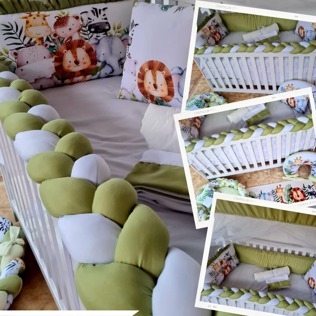 Kit de Berço Safari Baby Verde 10 Peças com Protetor Lateral Trança