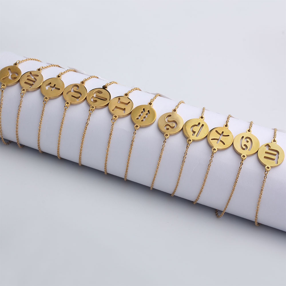 FINE4U Jóias 18k Ouro Banhado 12 Constelações Do Zodíaco Pulseira Da Moda Mulheres Boutique Pulseira Da Moda Jóias De Aniversário Por Atacado Presente (Em Estoque)