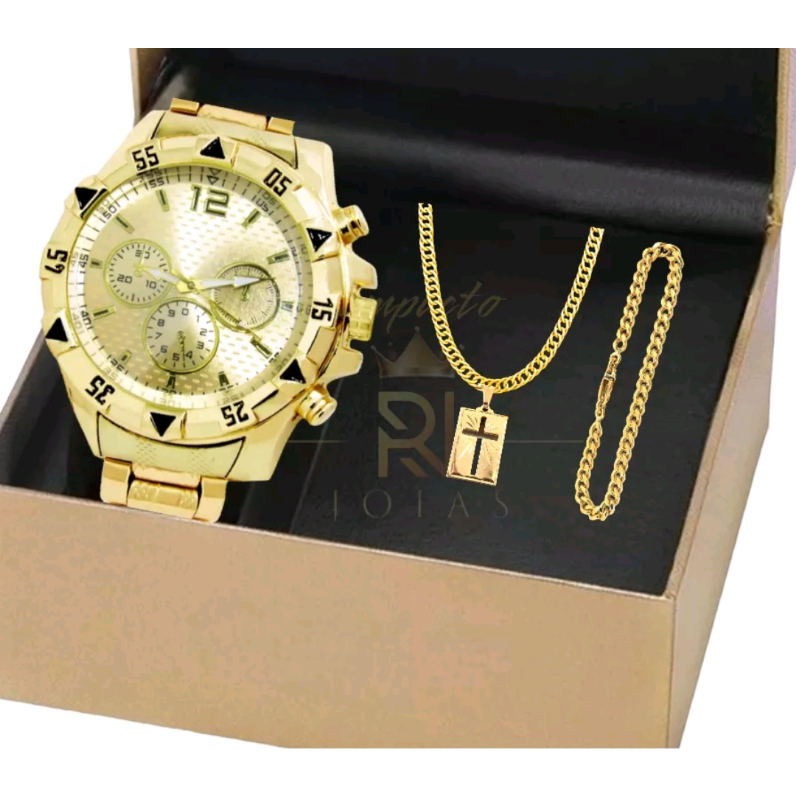 Kit Relógio Masculino Banhado a Ouro 18k Dourado + Corrente em Aço Banhada 18k Masculina + Pulseira e Pingente