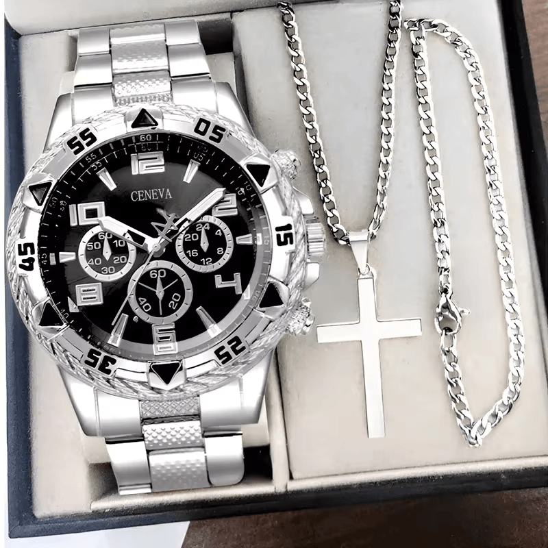 Kit Relógio Masculino Aço inox c/ Corrente + Pulseira e Pingente crucifixo