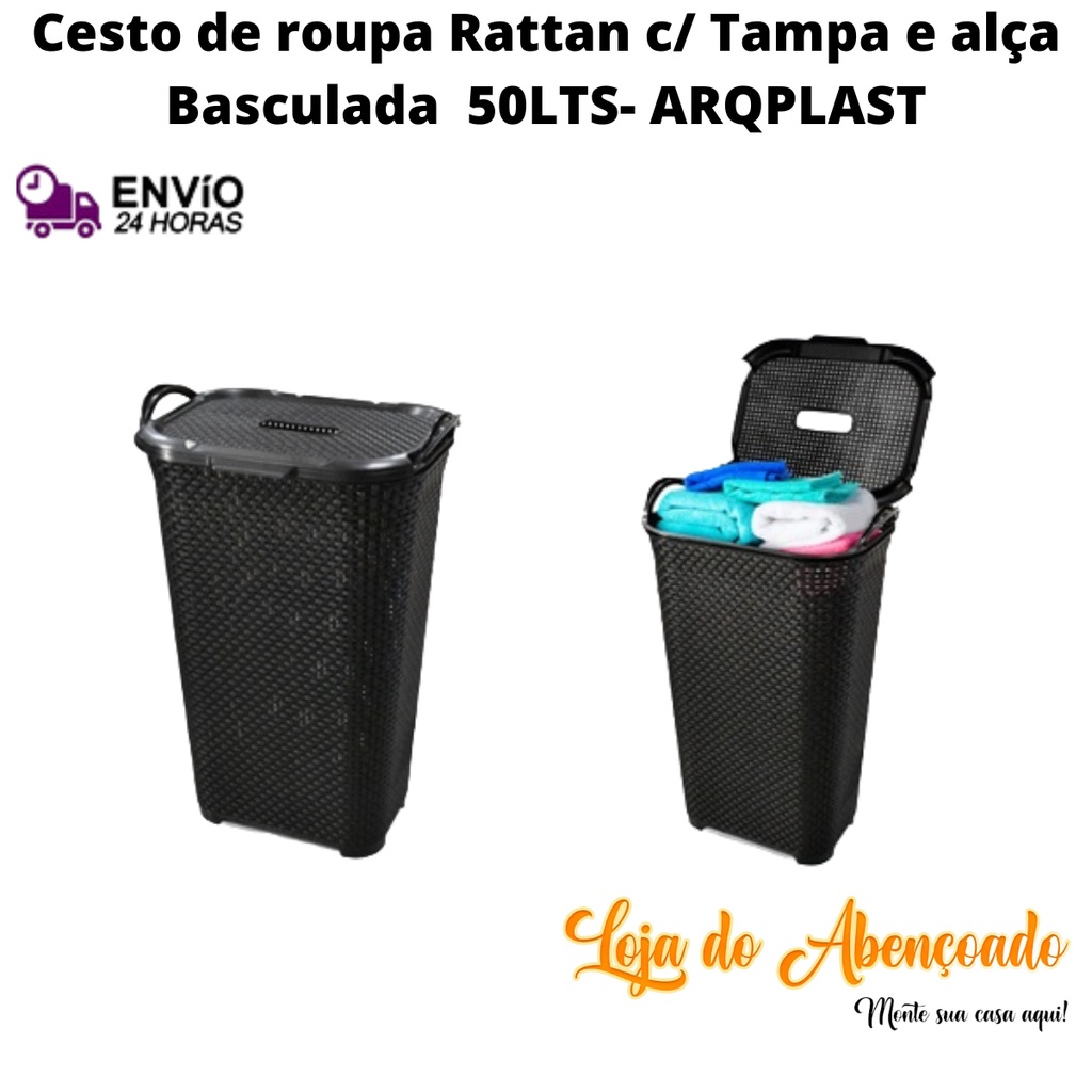Cesto de roupa Rattan c/ Tampa e alça Basculada 50 litros Preto - ARQPLAST
