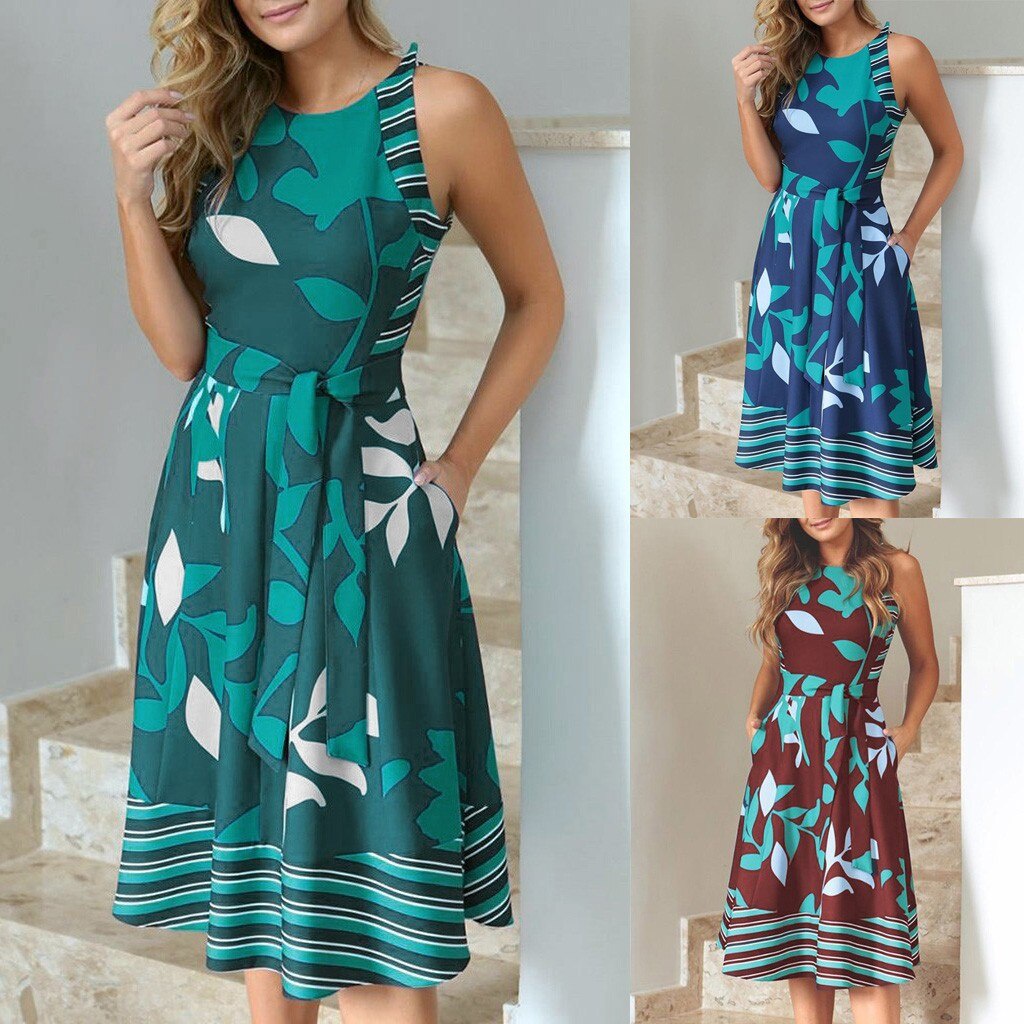 2021 Vestido Midi Feminino Estampado Decote Redondo Sem Manga Com Cinto
