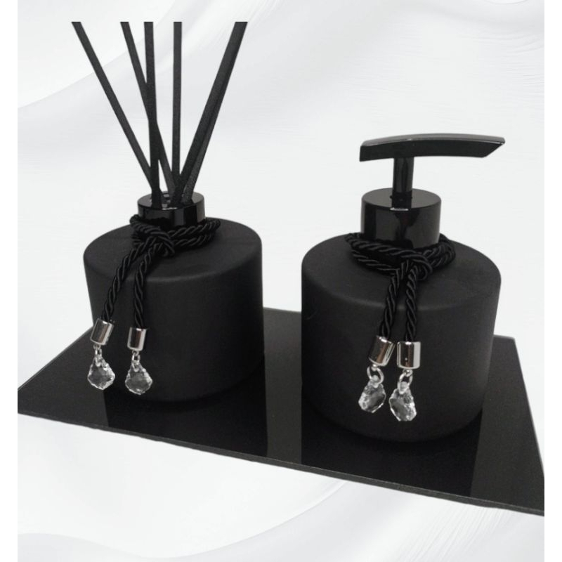 Kit Lavabo Picolo Preto Difusor de Ambiente 250ml, Vidro Saboneteira com Bandeja Preta