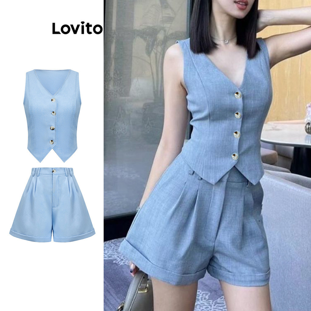 Lovito Conjuntos De Shorts Femininos Casuais Com Botão Liso E Bolso Frontal L65ED104 (Superior/Inferior)