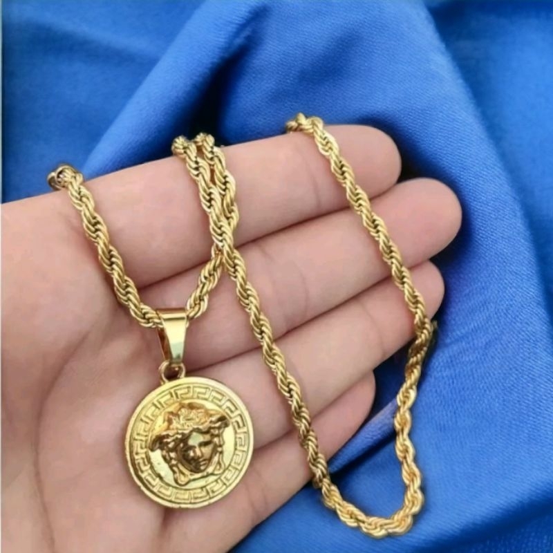 Corrente Masculina Cordão trançado Baiano 60cm Aço inox Com Pingente Medusas Corrente banhada a Ouro
