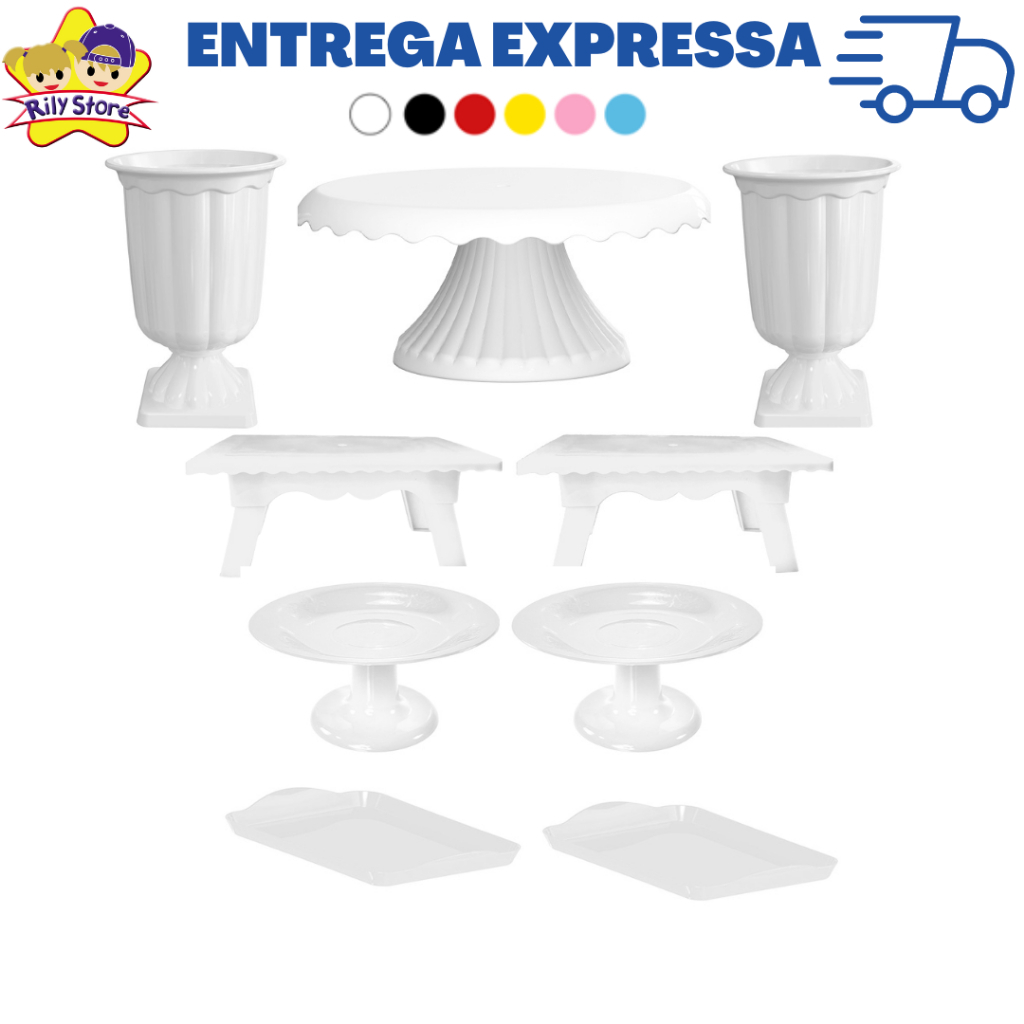 Kit Decoração Boleira Cake Renda 19cm + 2 Vasos Grego + 2 Mesinhas + 2 Bandejas 20x13 + 2 Mini Cake - Diversas Cores