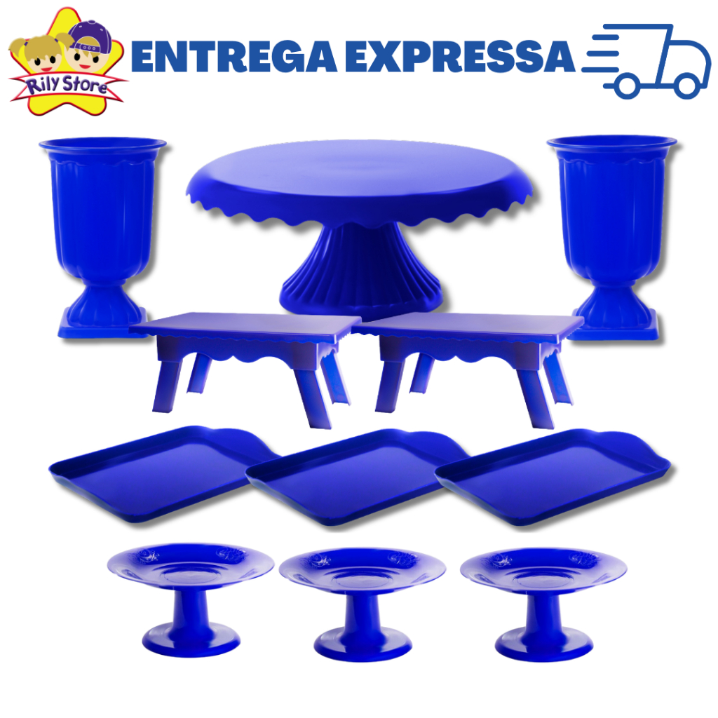 Kit New Decora Boleira Cake Renda 22cm + 2 Vasos Grego + 2 Mesinhas + 3 Bandejas 20x13 + 3 Mini Cake - Diversas Cores