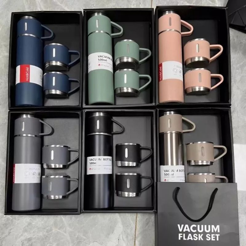 Kit Garrafa 500ML com 3 Xicaras Garrafa Termica Aço Inox Fosca Copo Termico