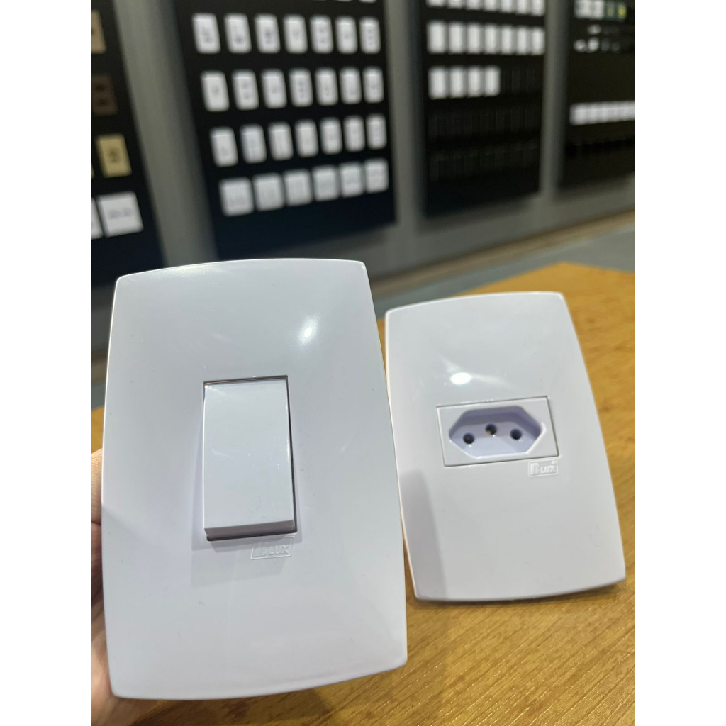 Monte Seu Kit de Tomadas e Interruptores Brancos Blux Home Conjuntos Completos espelhos módulos placas suportes, Tomada Dupla tripla 10A 20A Paralelo intermediário bipolar bivolt vermelha.
