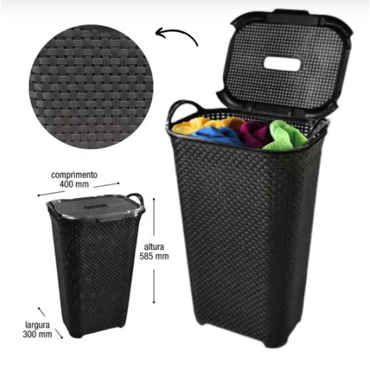 Cesto de roupa Rattan c/ Tampa e alça Basculada 50 litros Preto - ARQPLAST
