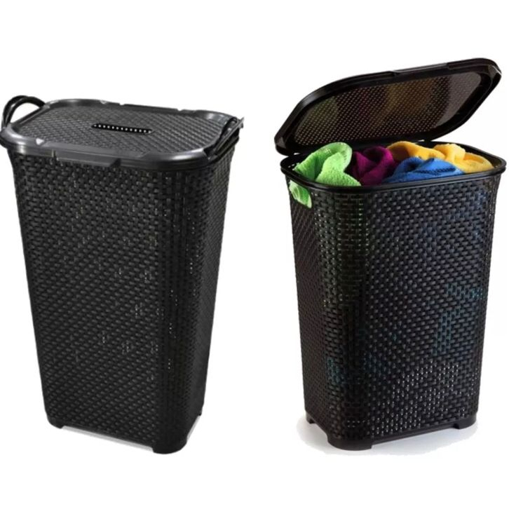 Cesto Organizador de Roupa Rattan Grande Com Tampa Basculada Preto 50 Litros Arqplast