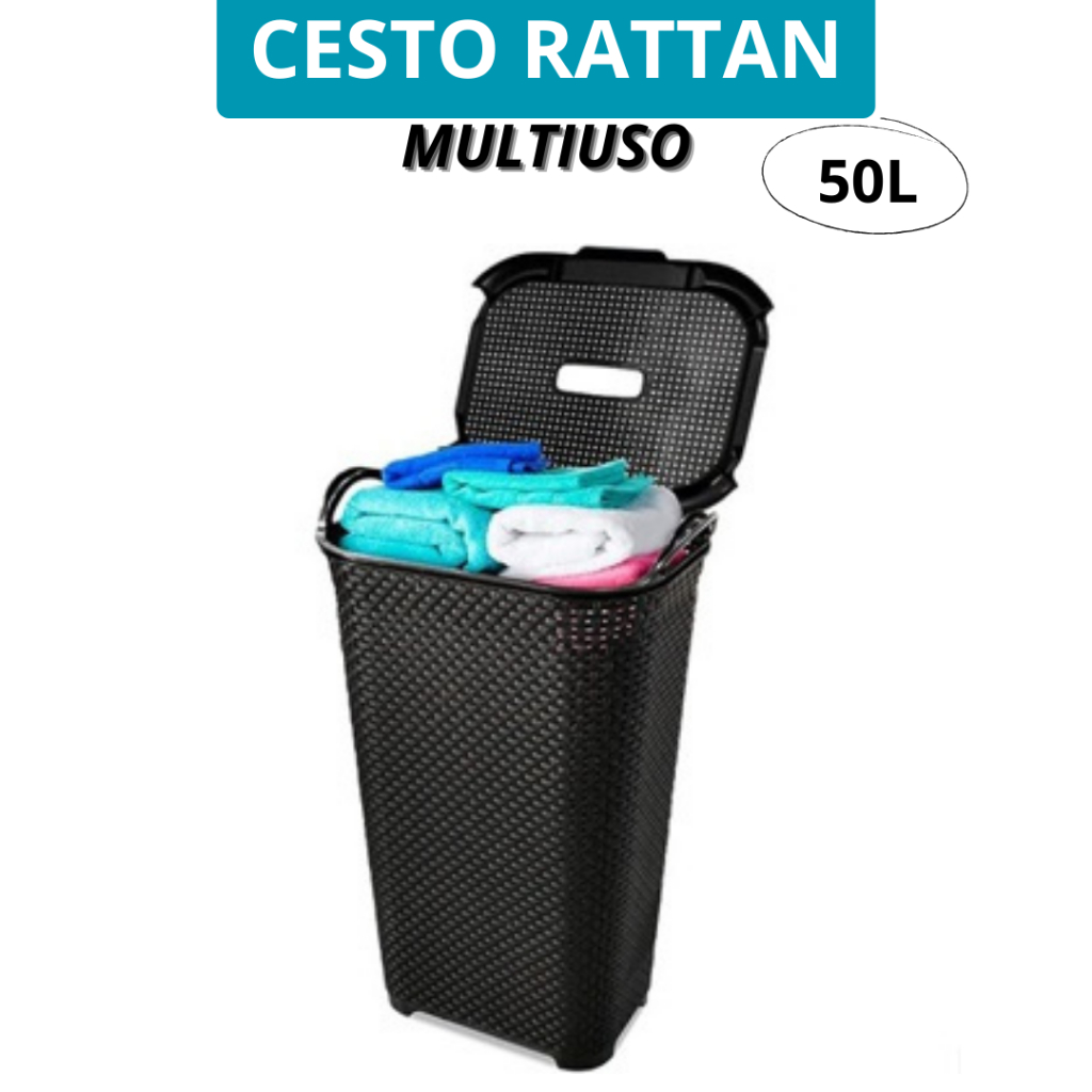 Cesto de roupa Rattan c/ Tampa e alça Basculada 50 litros - ARQPLAST