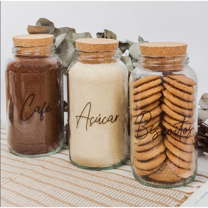Kit Cantinho do Café - Açúcar, Café e Biscoitos | 3 potes de Vidro 830ml com Tampa Rolha + Adesivos