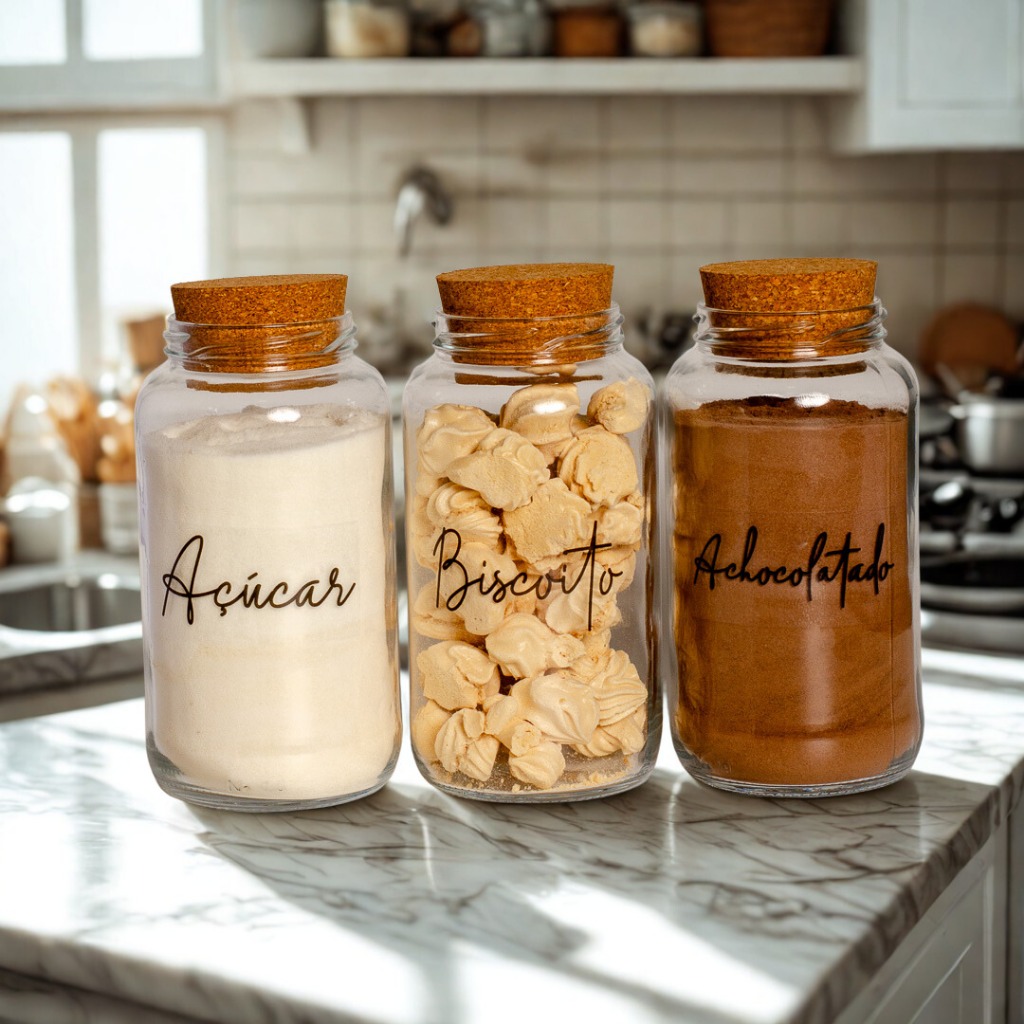 Kit Cantinho do Café - Achocolatado, Leite em Pó e Biscoitos | 3 potes de Vidro 810ml com Tampa Rolha + Adesivos