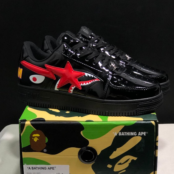 Bape Sta Five-Pointed Star Ape Head Low-Top Patenteado Couro Branco Sapatos de Corrida Femininos Pretos Sapatos de Corrida Femininos de Tênis de Altura Sapatos Casuais Universitários de Tênis Casal Sapatos Esportivos