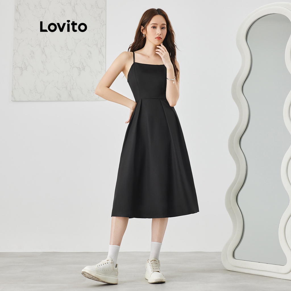 Lovito Elegante Vestido Liso de Alças com Decote Quadrado e Fenda para Mulheres LNS03LD102 (Preto)