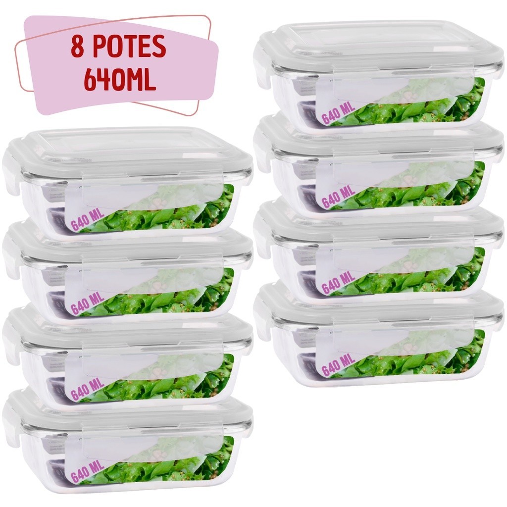 Kit 10 Potes Vidro 640ml Marmita Fitness Tampa Hermética 4 Travas Para Microondas e Freezer