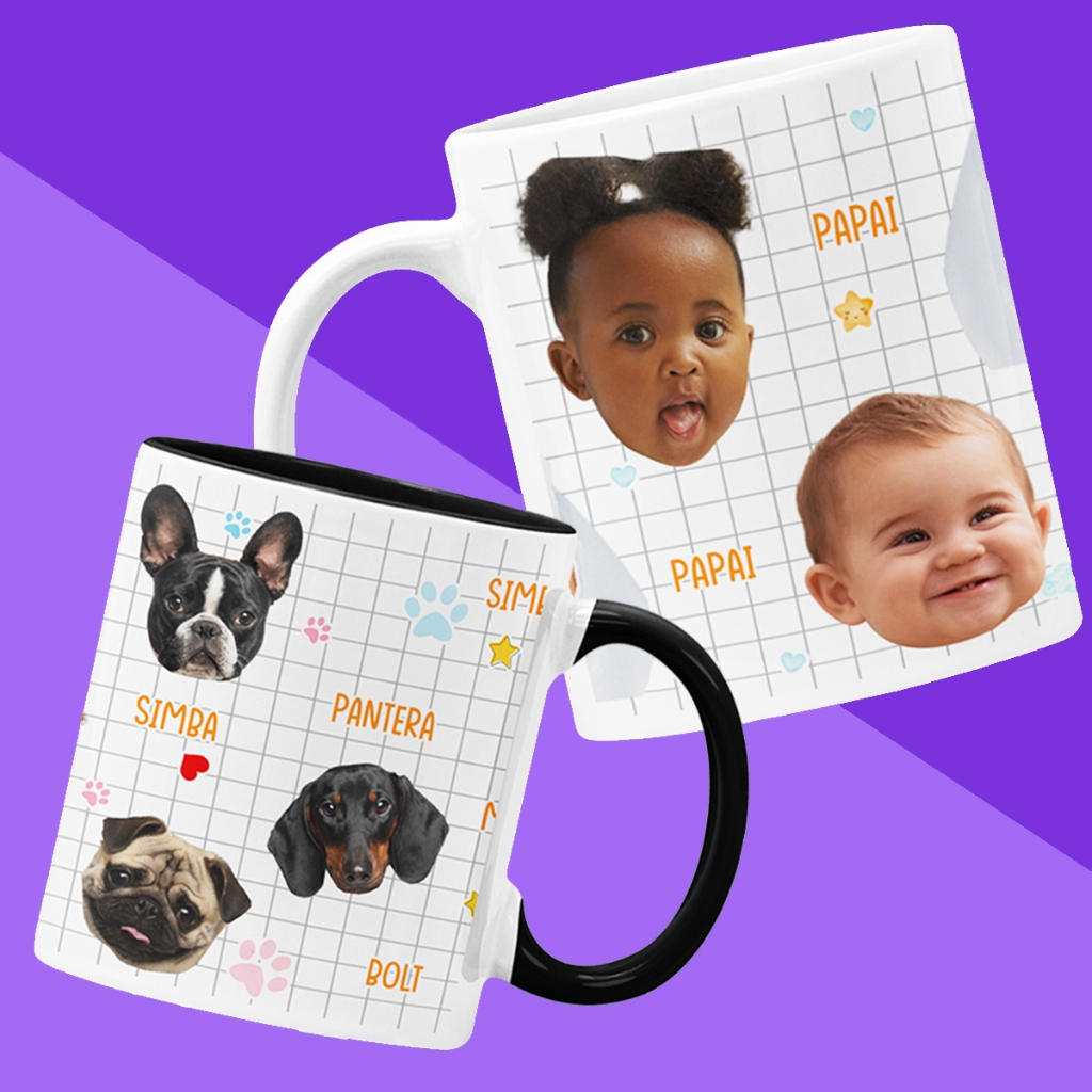 Caneca Cachorro Gato Pet Ou Rost Filho Bebê Pessoa + 5 Personalizada Nome e Apelidos - Alça e Interior Colorido ou Branca - 325ml