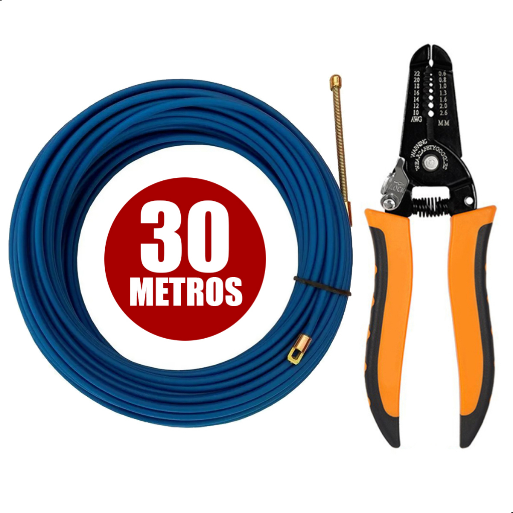Kit eletricista Passa Fio Sonda Alma de Aço 30 Metros + Alicate Tesoura Cortador Descascador Cabos e Fios