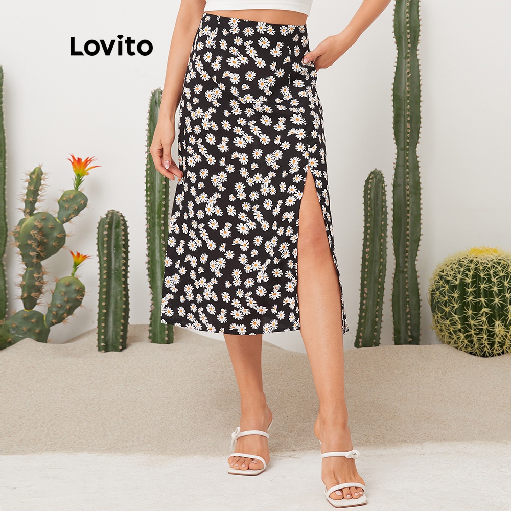 Lovito Saia Casual com Estampa Floral e Boca com Fenda L11D33 (Preto)