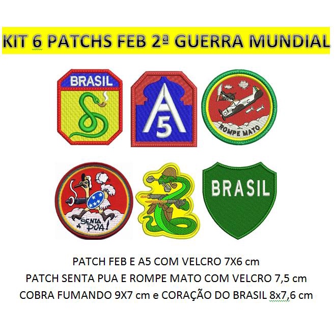 KIT 6 PATCH BORDADO FEB Oficial 2ª Guerra Mundial - FORÇA EXPEDICIONÁRIA BRASILEIRA com CARRAPICHO ou sem CARRAPICHO para ser costurado e também termocolante.